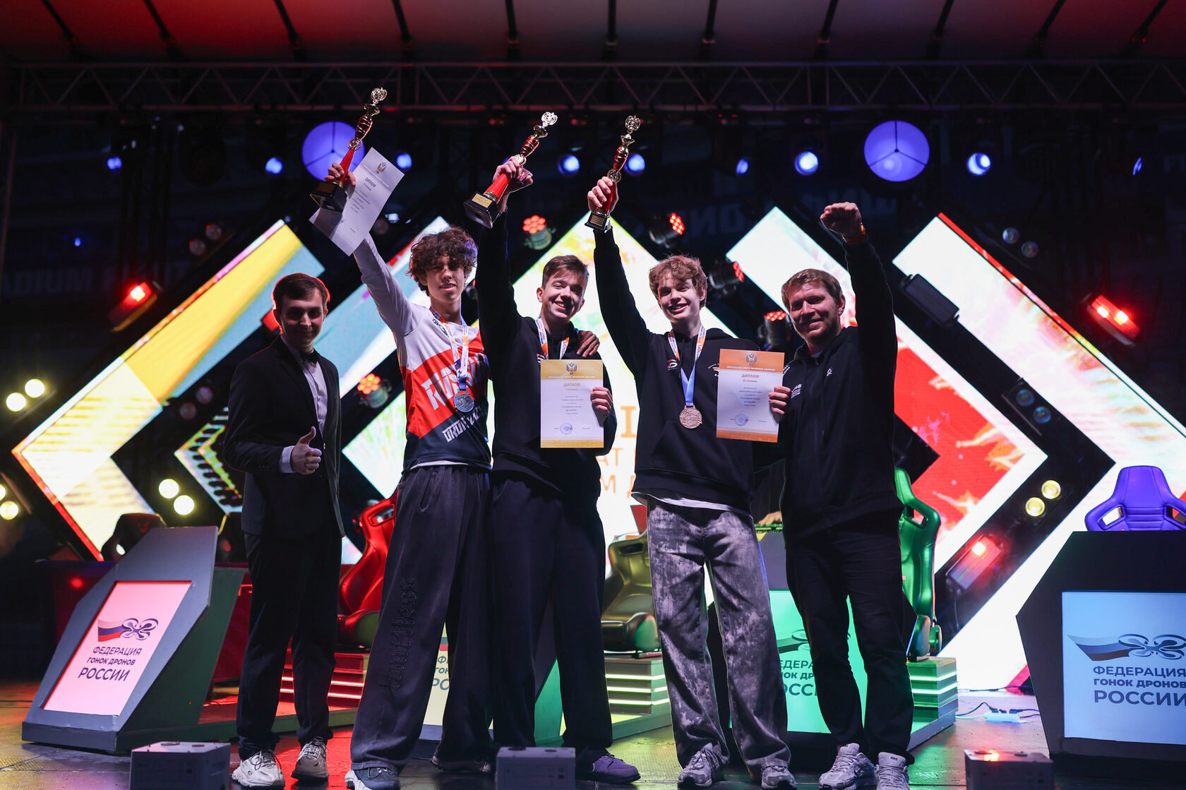 В командном зачете дисциплины «класс 75»чемпионами страны стали 16-летний Матвей Почекунин и 22-летний Максим Нор из Новосибирской области. Почекунин и еще один сибиряк 16-летний Вячеслав Капрыза также завоевали золото чемпионата России в командном зачете дисциплины «технический симулятор». В личном зачете этой дисциплины чемпионом стал 16-летний Платон Черемных из Москвы. И, наконец, в самой престижной дисциплине – командной гонке дронов 330 класса – победили представители Ленинградской области 18-летний Григорий Миронов и 17-летний Даниил Волок.
